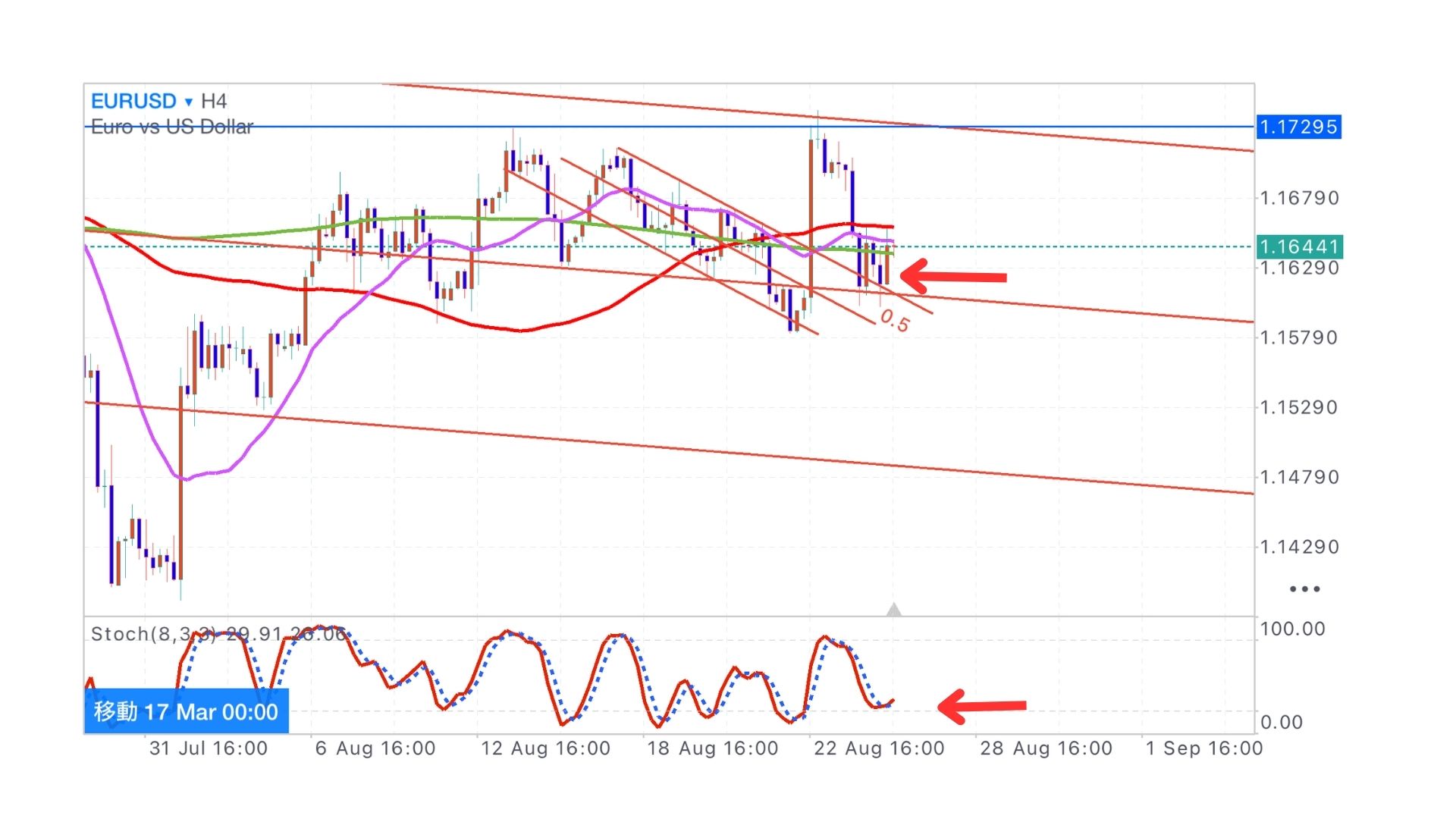 4時間足では、若干ずれましたが下降チャネルのレジサポ転換に成功したと捉えています。
