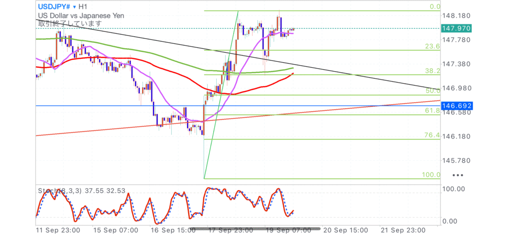 148.2付近まで上昇したあと、FR38.2にて反発しました。