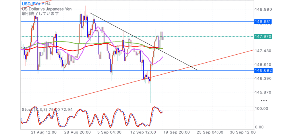 4時間足では下降トレンドラインを明確に上抜けしました。