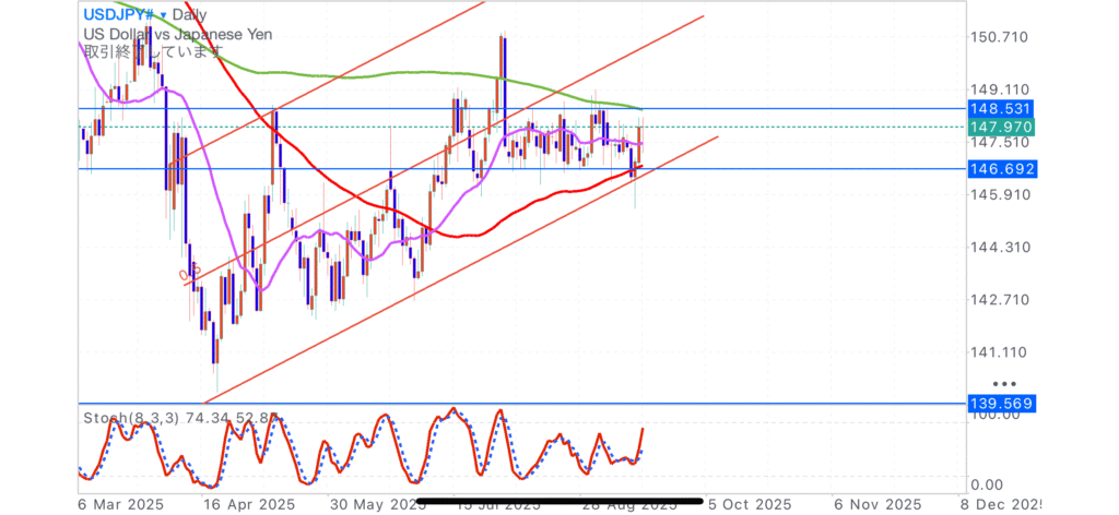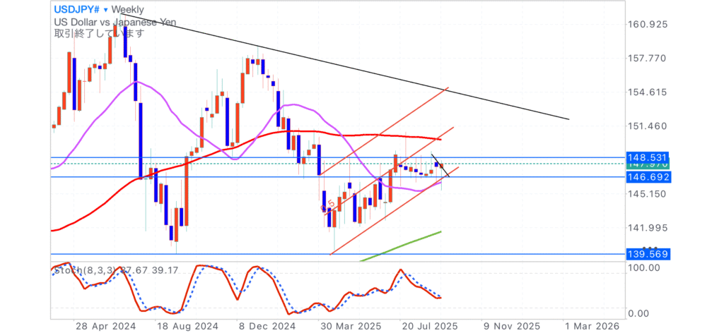 148.5付近には緑色の200MAが存在しているため、来週も一度抑えられると見ていますが、先ほどの週足ストキャスティクスがゴールデンクロス間近なことから、レンジ上抜けに期待しています。