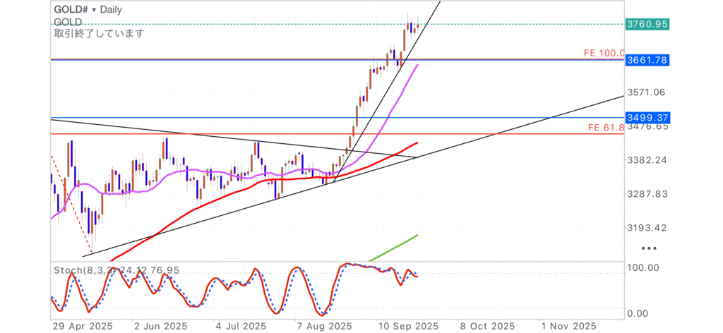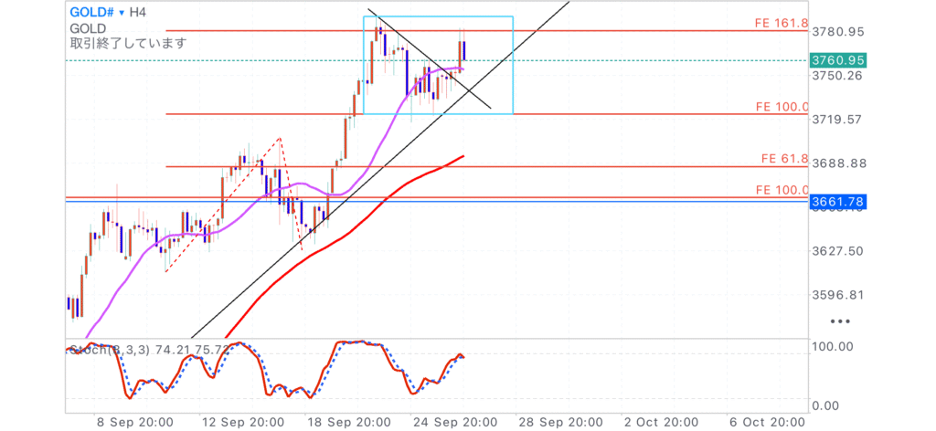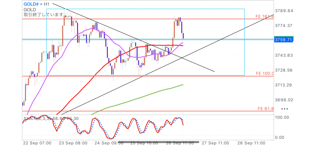 4時間足では、3720~3790くらいでのレンジ相場となっています。