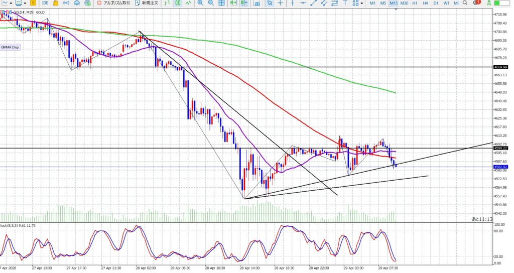 15分足レベルでは、昨日の下落トレンドは終了しましたが、現在は横軸調整中といった形です。