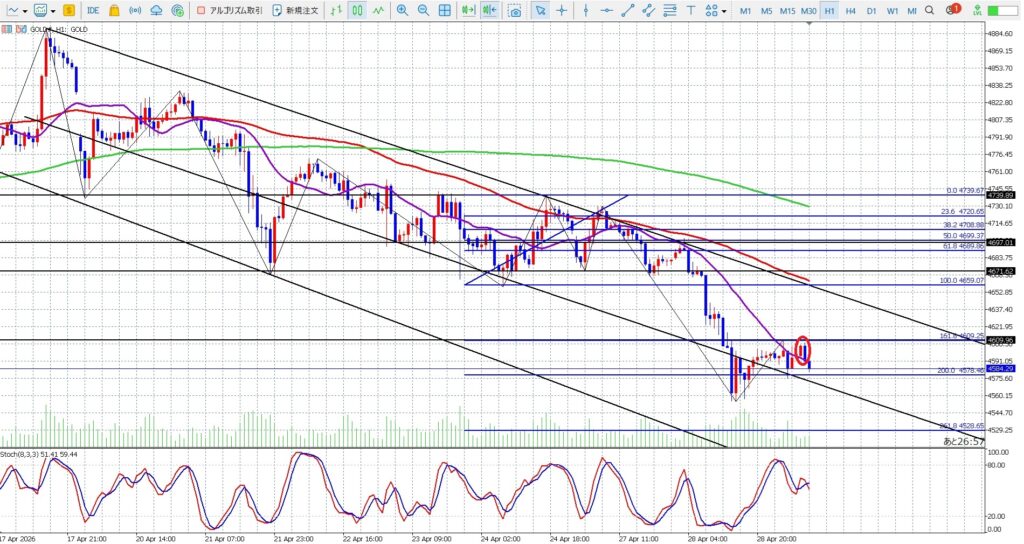 1時間足では、一段上のレンジから今の下落のターゲットを算出しています。